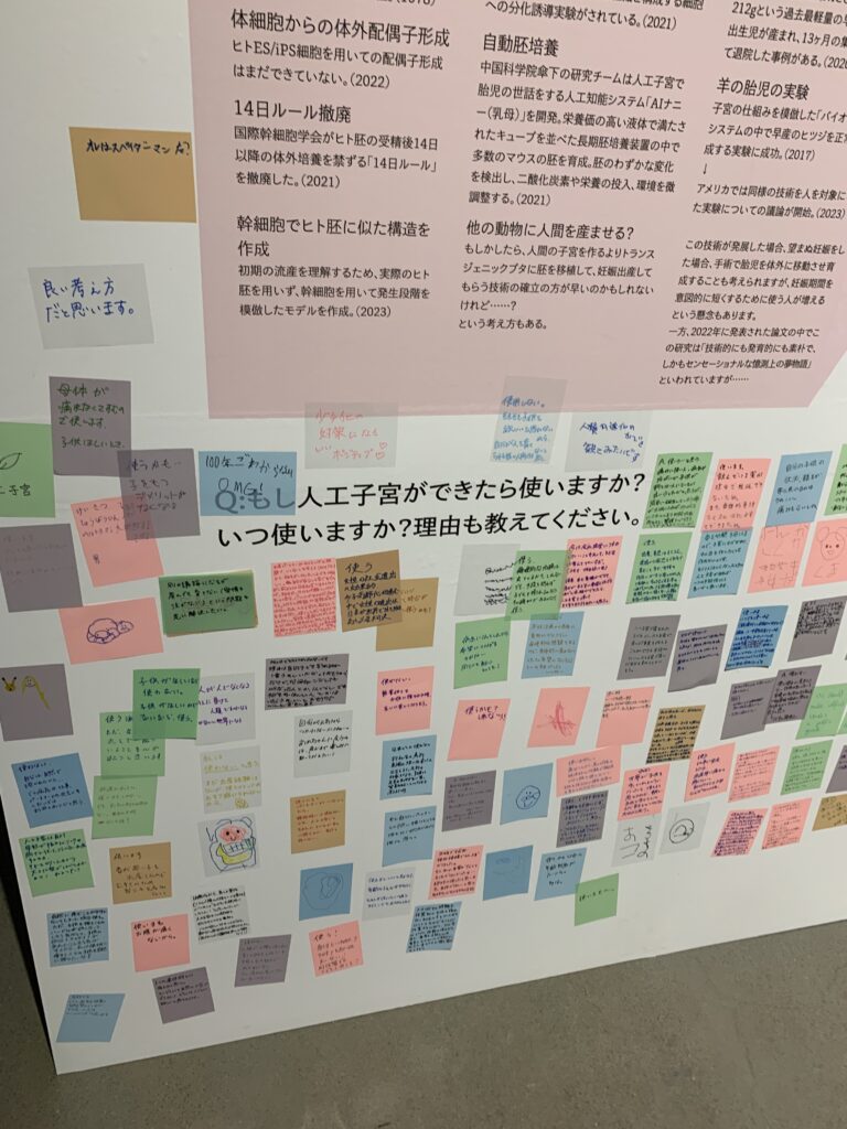 「もし人工子宮ができたら使いますか?」という問いに、来場者が答えを書いて貼っている。今も、書いて貼れるようになっている。その、書かれたものを読むのが興味深い。