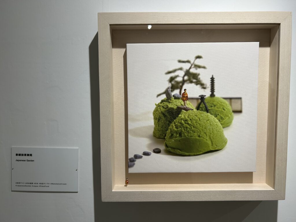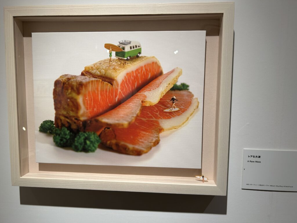↑食べ物出た。こういうの好きなんだよね。美味しそうだから。表題は「レアな大波」。霜降りの筋がまるで波しぶきのよう、って事か。見てるお客さんが、食品サンプルをどうやって切ったのー?と話していたが、多分こういうサンプルがあったんじゃないかな。でも、切る事も出来そうだし、こういうのを作って欲しいと注文する事も出来そうだね。