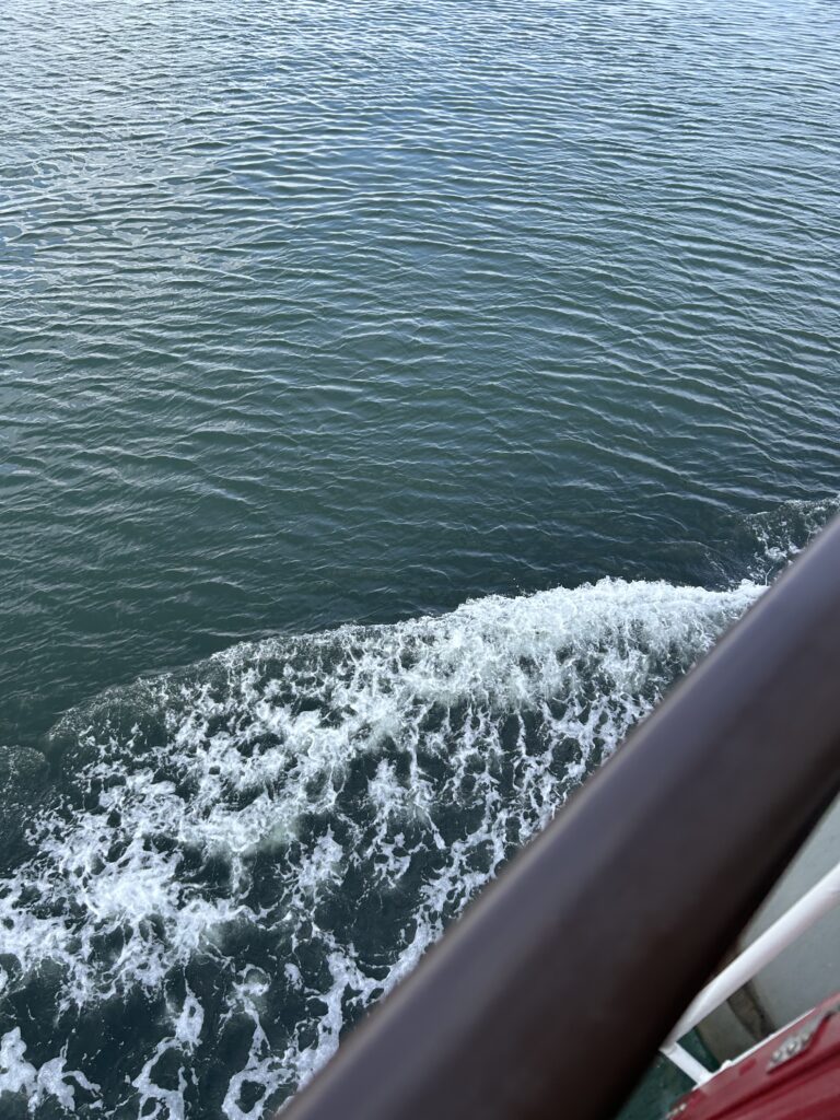 私服だが、明らかに修学旅行生の団体が一緒にフェリーに乗って来た。先生は、先生と分からぬように立っている。高校生だろう。男子はガキだな。