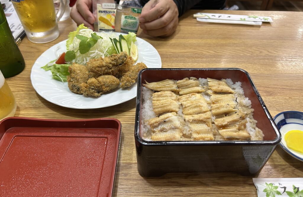 そして、お待ちかね。まずはカキフライ。これがまた、美味ーい!こんなに美味しいカキフライは初めてだ。それと、あなご飯は一人前を二人で分けた。名物だけれど、やっぱりカキと一緒だとインパクトが薄くなるね。