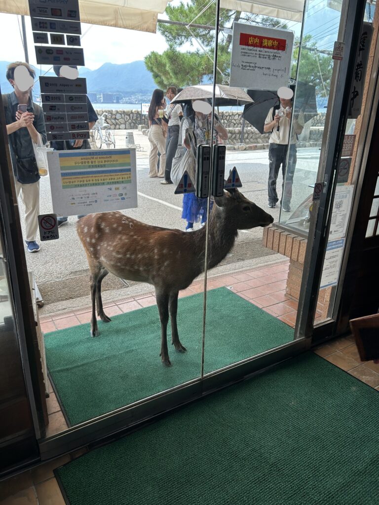 食べ終わって店を出ようとすると、何と自動ドアの前に鹿!どうやって出るの?