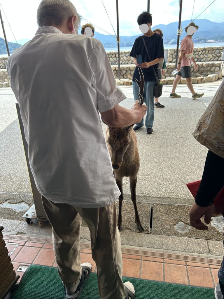すると店主、大丈夫です、お任せくださいと。ドアが開くと鹿の角をしっかと掴み、ゆらゆらさせながら、おらおら、だったかな。なんか言いながら鹿を横へと追いやり、我々は無事に店を出られた。その鹿の扱いを高校生男子たちが面白がって近くで見ていた。