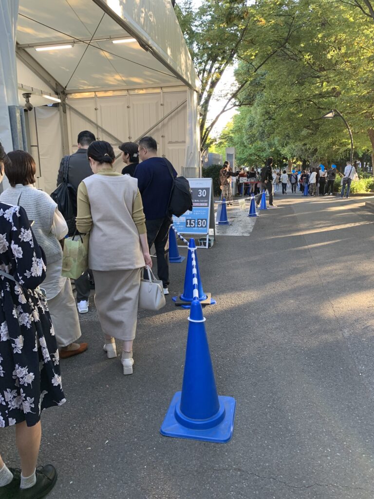 先の方に目をやると、どうも行列が見える。あまりよく見えないのだが、なんの列だろう。「ショップ」という文字が見えるような見えないような……。もしかして、限定グッズとかがあって、並んで買う人がいるのかも?