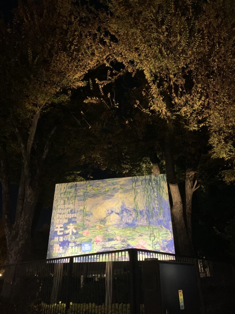 建物の灯りを目指して歩いて行くと、途中でモネ展の看板があった。暗くて顔の見えない女性の職員さんが、