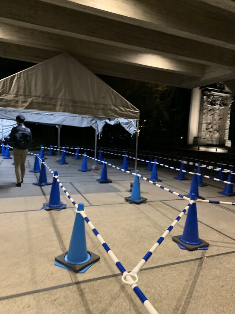 と、私から見て右の方を手で示していた。そちらへ行ってみると、工事中みたいな所だったが、並ぶための囲いが出来ていた。普段はこんなに並ぶのだろうか。土日の昼間は並ぶのかも。