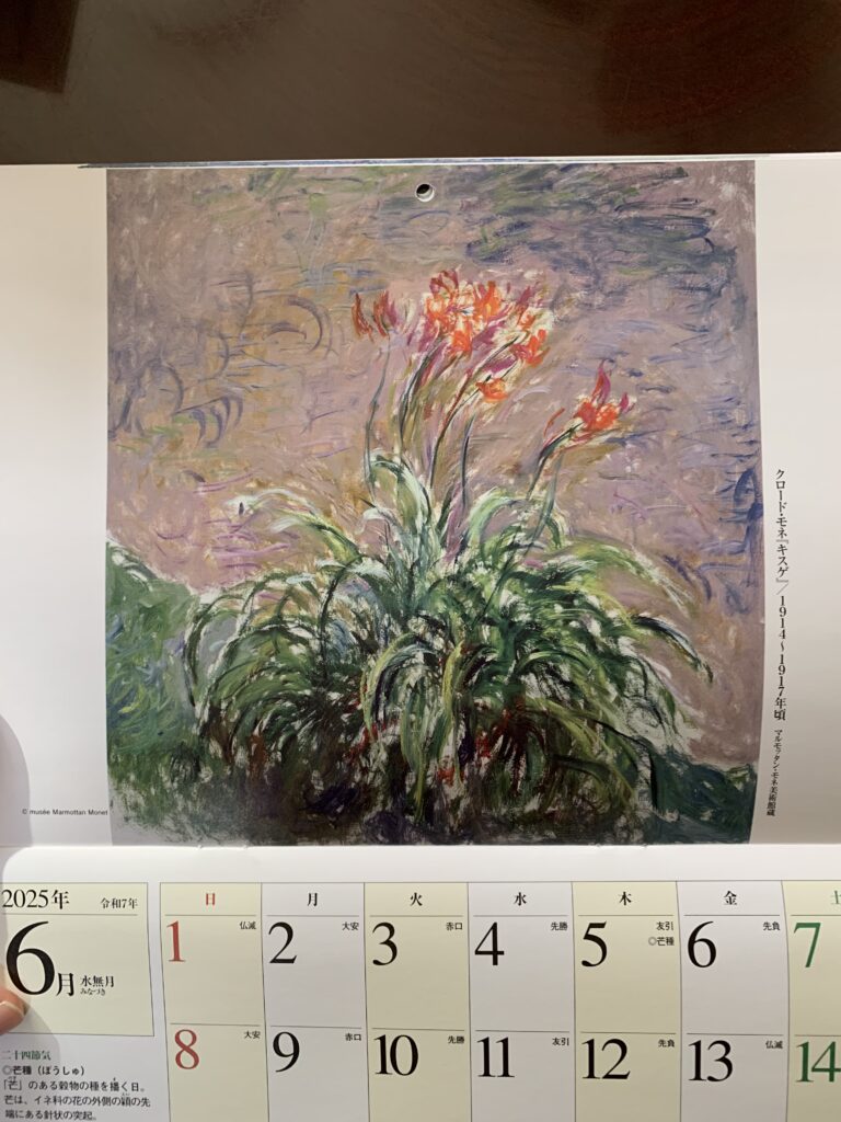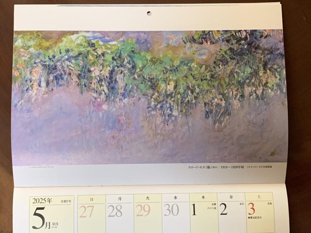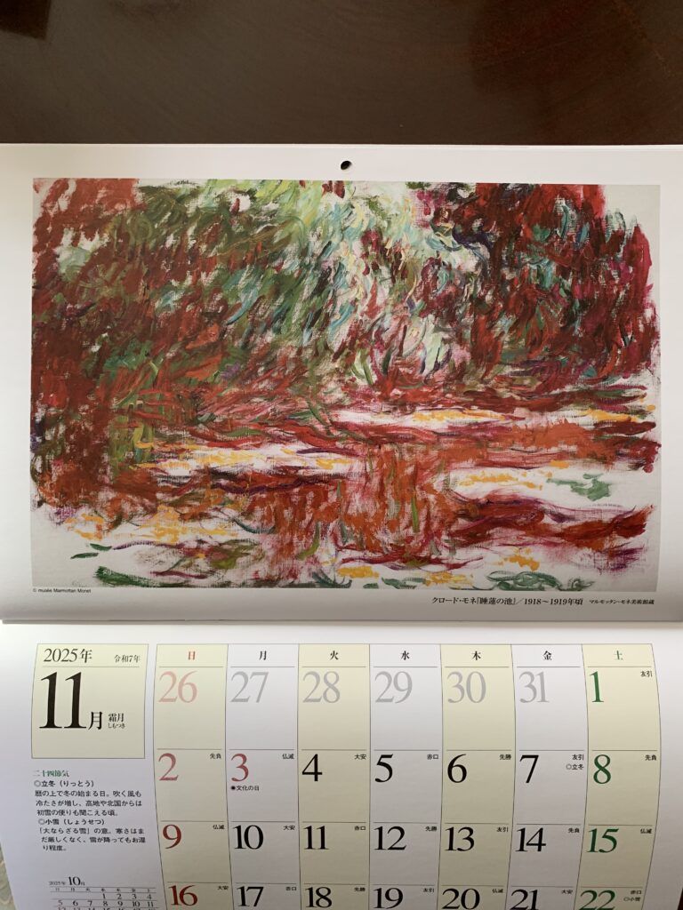 ここで1つ言っておくことがある。実は先日、サライという雑誌を買った。付録が目当てだった。その付録というのがモネ展のカレンダー。モネ展ではショップが混み過ぎて何も買えないかもしれないと思い、飛びついたのだ。これ、絶対に即売り切れるぞと思って。そのカレンダーの写真を、今回ブログに説明の為に載せようと思う。カレンダーだと分かるようにわざと変な写真にしてある。