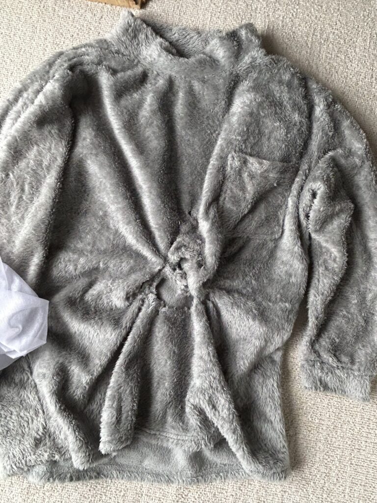 ネットにも穴が開いているが、もうネットと中のパジャマがくっついて一体化していた。とにかくネットから取り出さねばならないので、剥がした。パジャマを出してみたらやっぱり……穴が開いている。開いている、なんてもんじゃない。もう、トルネード。ねじ切られている感じか。焼けて溶けたような感じでもある。