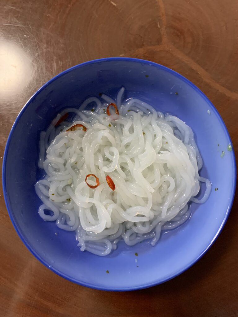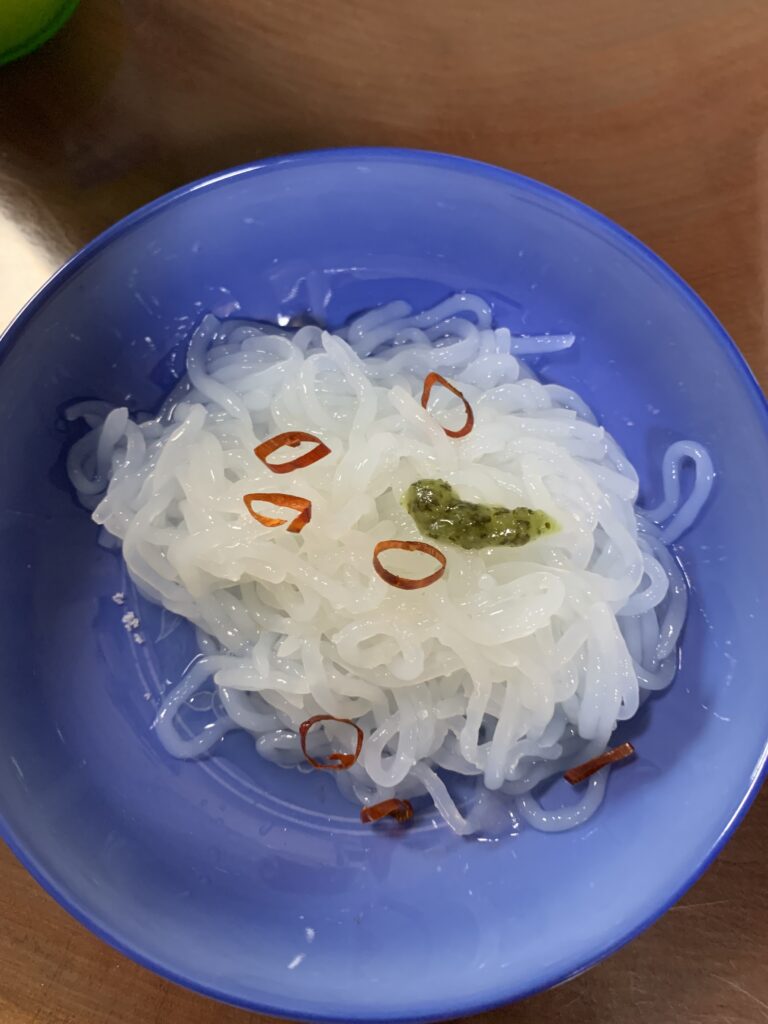 味は、酸っぱいけれども酢ではなくレモン汁なので、さわやかで涼しげ。私はパクチー味があれば何でも大抵美味しく感じる。これも、非常に美味しい。食感は、意外に柔らかい。まあ、ところてん的な?