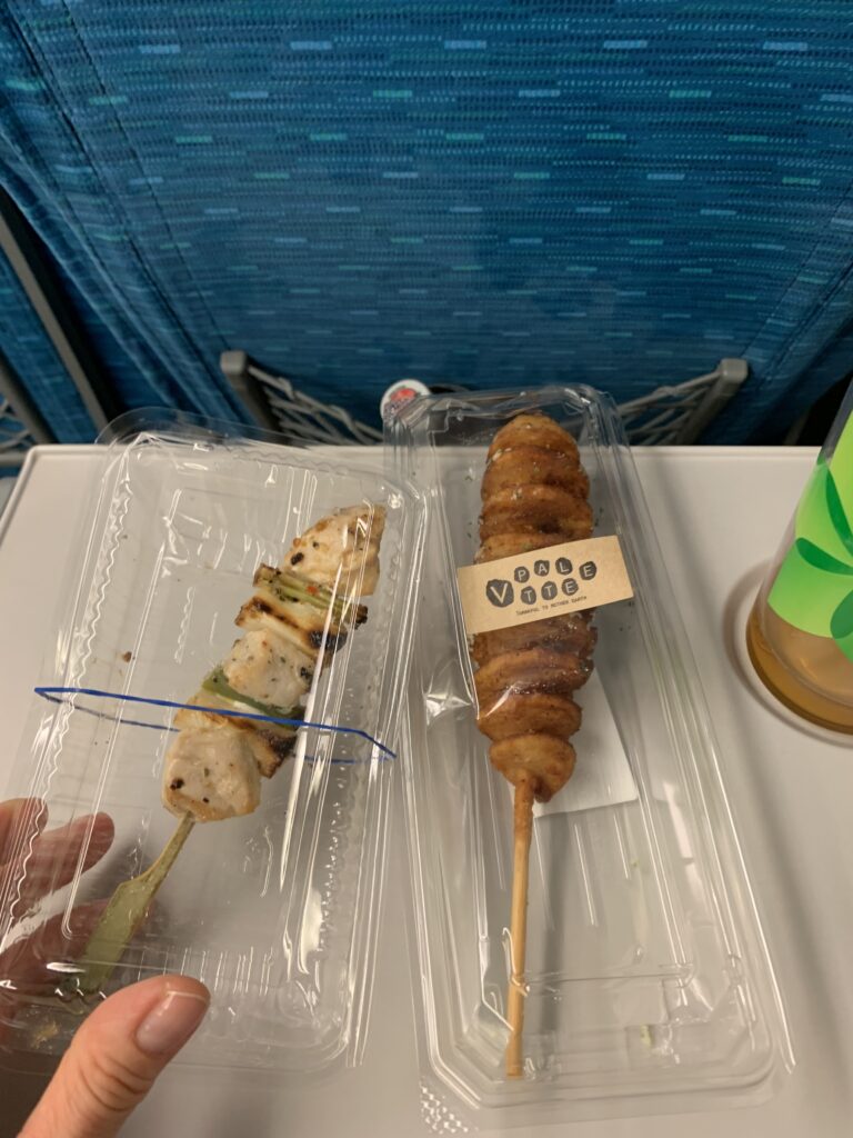 で、結局買ったのが「ムネネギ串レモンペッパー」と「クルクルポテト」。別々の店で、1本ずつ買ったのだ。なんか、レモンペッパーにそそられた。クルクルポテトならコリアンタウンで食べられたのに、なんだかやっぱりそれが食べたくて。もっとおしゃれな感じのポテトも売っていたのに。