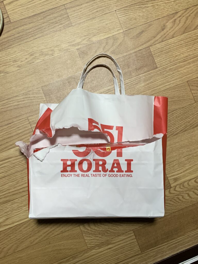 家の玄関のカギを開けている時に、気づいた。551の紙袋が破けている!もう少しで完全に中身を落とすところだった。小さい保冷剤はいつの間にか落としていたようだ。危なかった。傘を持つ手の肘に掛けていたので、外側だけ雨に濡れてちぎれたのだろう。からしは無事だった。