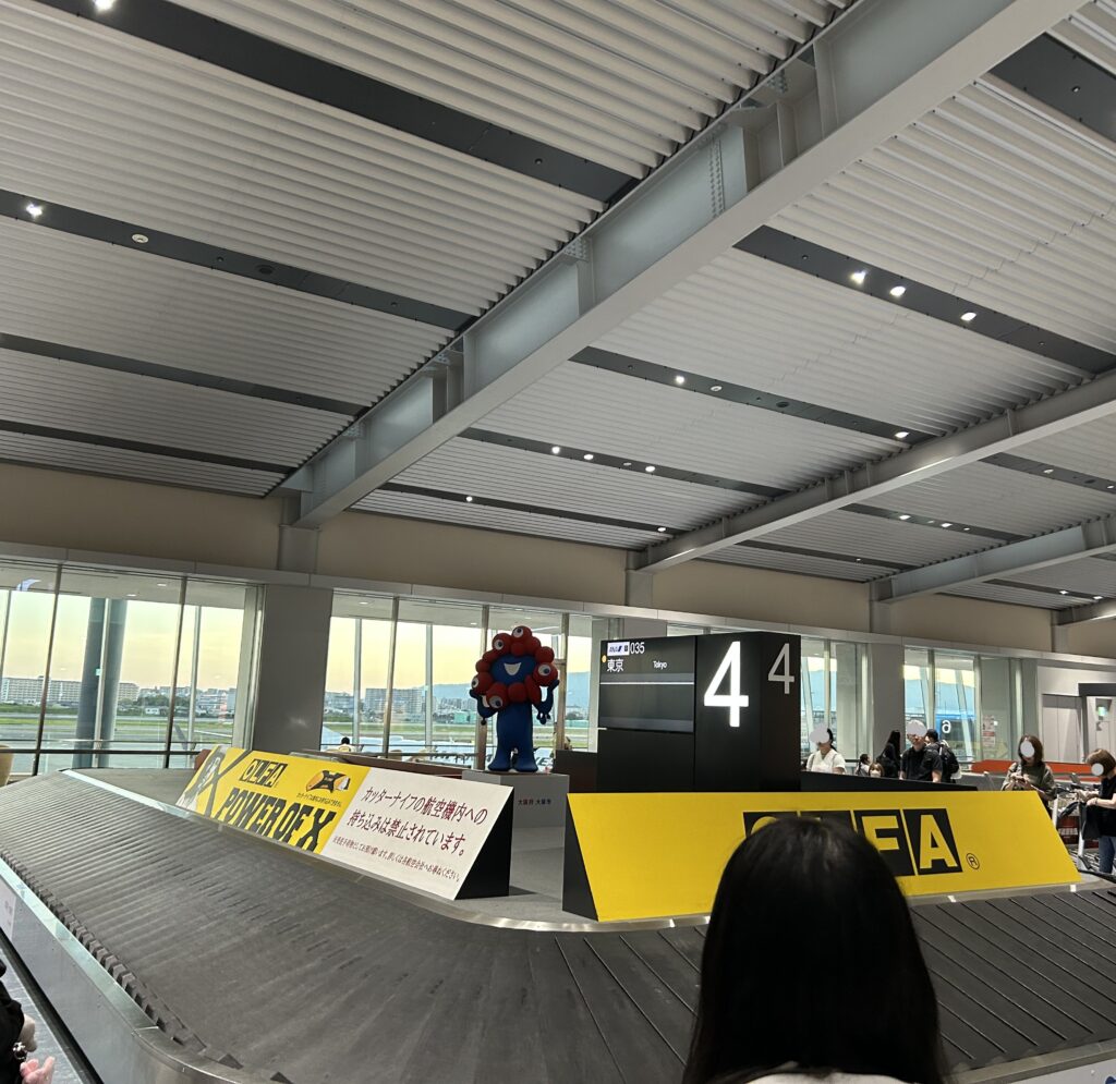 手荷物がなかなか出て来ない。やっぱり預けない方が良かったか?真ん中にミャクミャクがいるけれど、暗くて目立っていない。