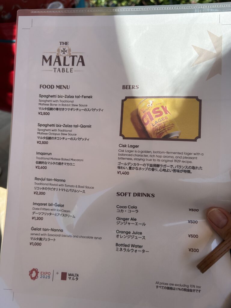 そして、何となくこの辺なら入れそうでレストラン付きのパビリオンが並んでいるぞ、という場所へ行って、長男が「地中海料理がいい」と言ってマルタ館に決めた。