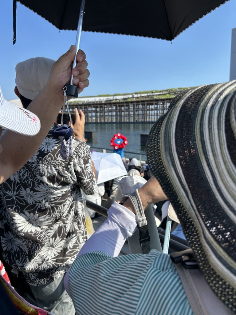 ゲートの屋根の下にはちょっと入れないな、くらいの場所に並んだ。夫が日傘を差す。私と次男が半分こしながら菓子パンで朝ごはんを食べる。もう夫と長男は食べ終えていた。待ちきれない人達だから(笑)