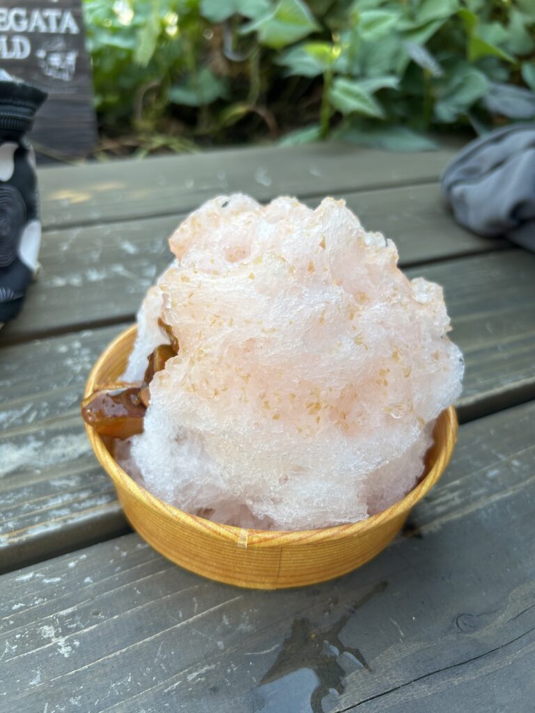 らぽっぽのかき氷。りんご味。左側に添えてあるのは大学芋。