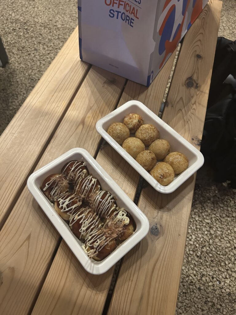 まだ大阪で食べていなかったので、たこ焼き。オリジナルとガーリック塩だっけな。長男と分けて食べた。疲れてあちこち行ったり並んだりできそうもなく、ちょうどシャインハットの前のベンチが空いていたのでそこに座って食べた。そこからショーも見られてラッキーだった。