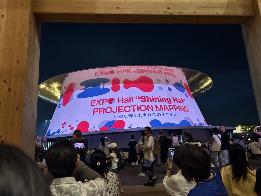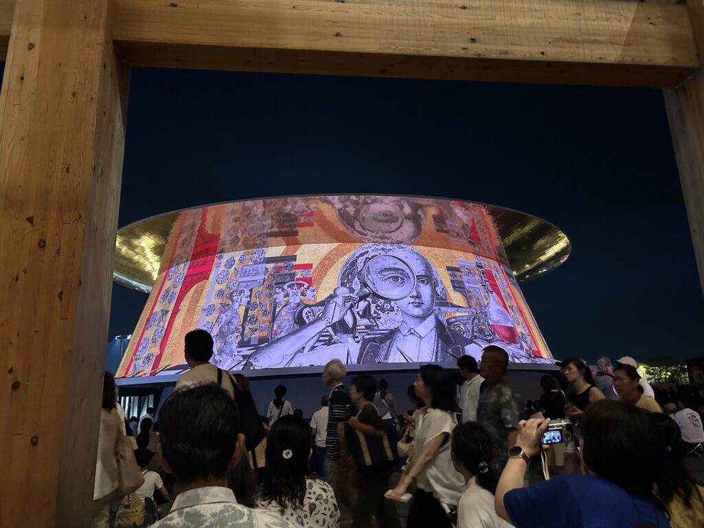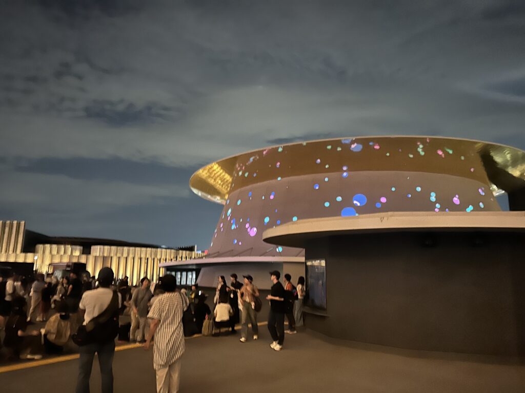 私が入ったパビリオンはこれだけだ。子供たちはそれぞれ、ブラジルやトルクメニスタン、北欧館や飯田グループX大阪公立大学共同出展館などに入ったらしい。夫は途中で暑さと人込みにギブアップ。ビール飲むと余計に暑いしね。日が沈む前にホテルに帰ってしまった。夜になれば涼しくなるのに……。