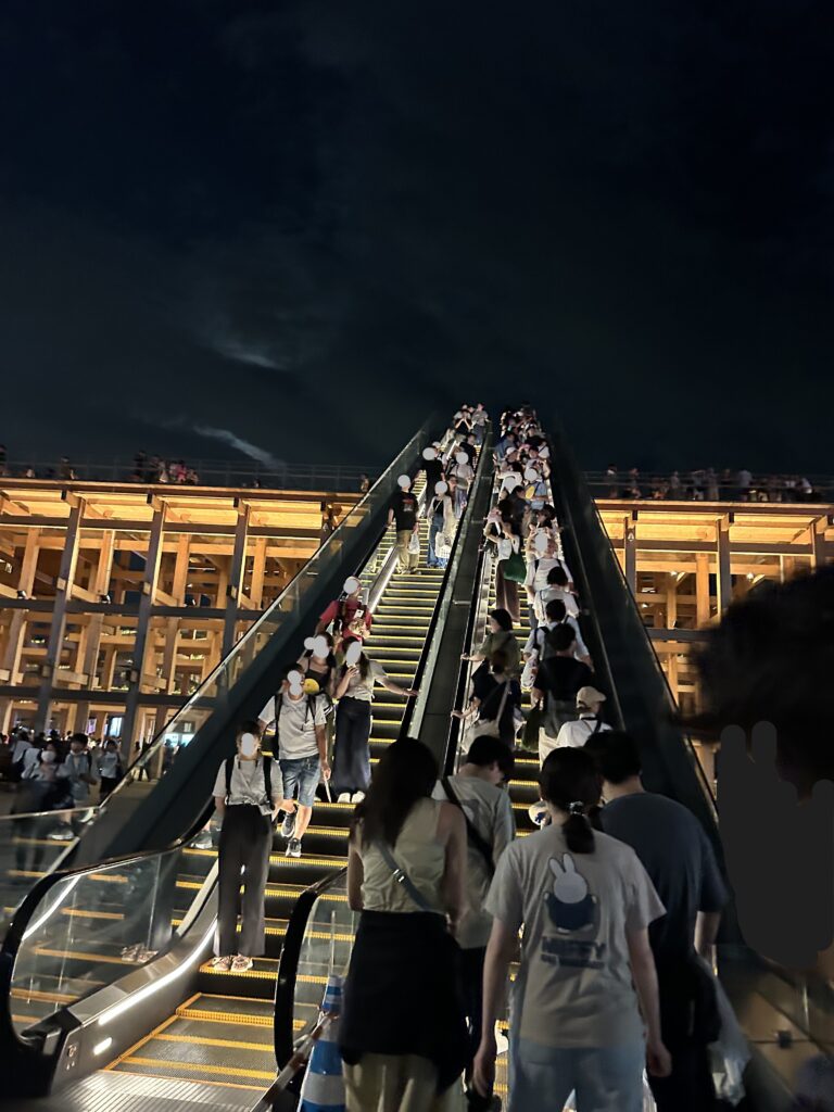 ドローンショーが終わると皆一斉に東ゲートへと流れる。次男とも合流し、まずはもうすぐ閉鎖されるというリングを降りた。