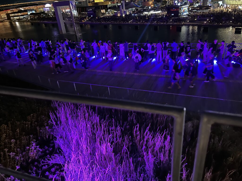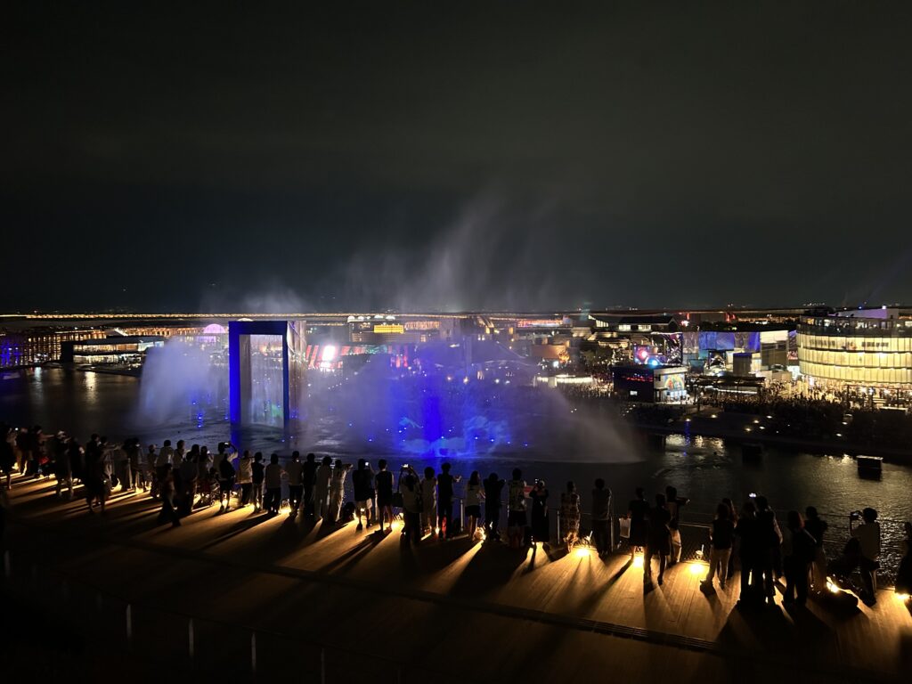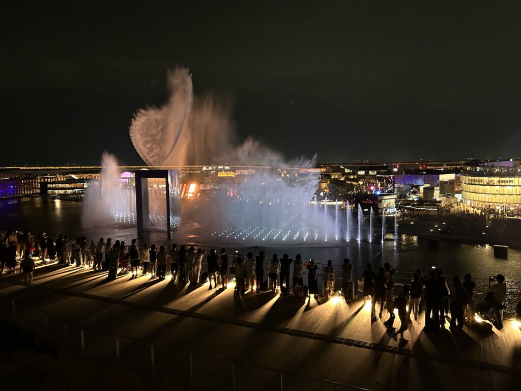さて、水上ショーが終わると次はいよいよドローンショーだ。私はこれを絶対に見たかったので、途中で帰りたいとは絶対に思わなかった。夜になって涼しくなり、リングの上は風が強いので上着を着ていてちょうどいい気候だった。