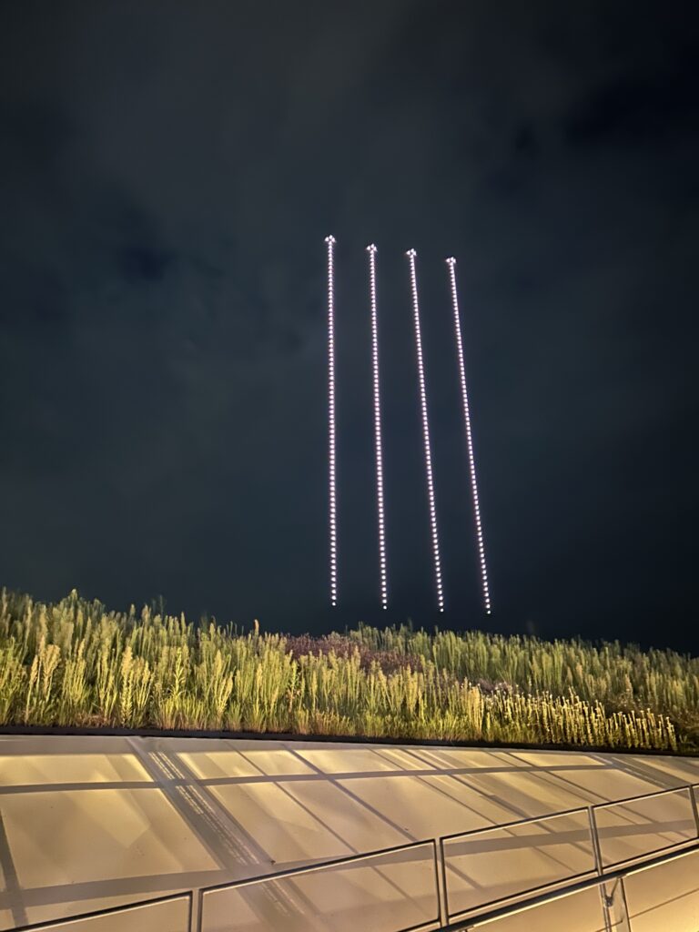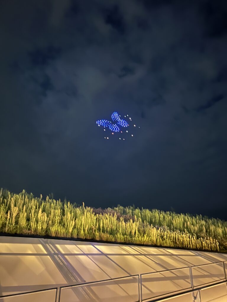 と思ったら、なんと後ろ!目の前だ。邪魔な物がないが、首が痛い。地上のベンチに座って見る方が良かった、と思ったがもう遅い。次男が我々に合流しようとしたようだが、もうドローンショーの前に最上階には上れなくなっていたそうだ。