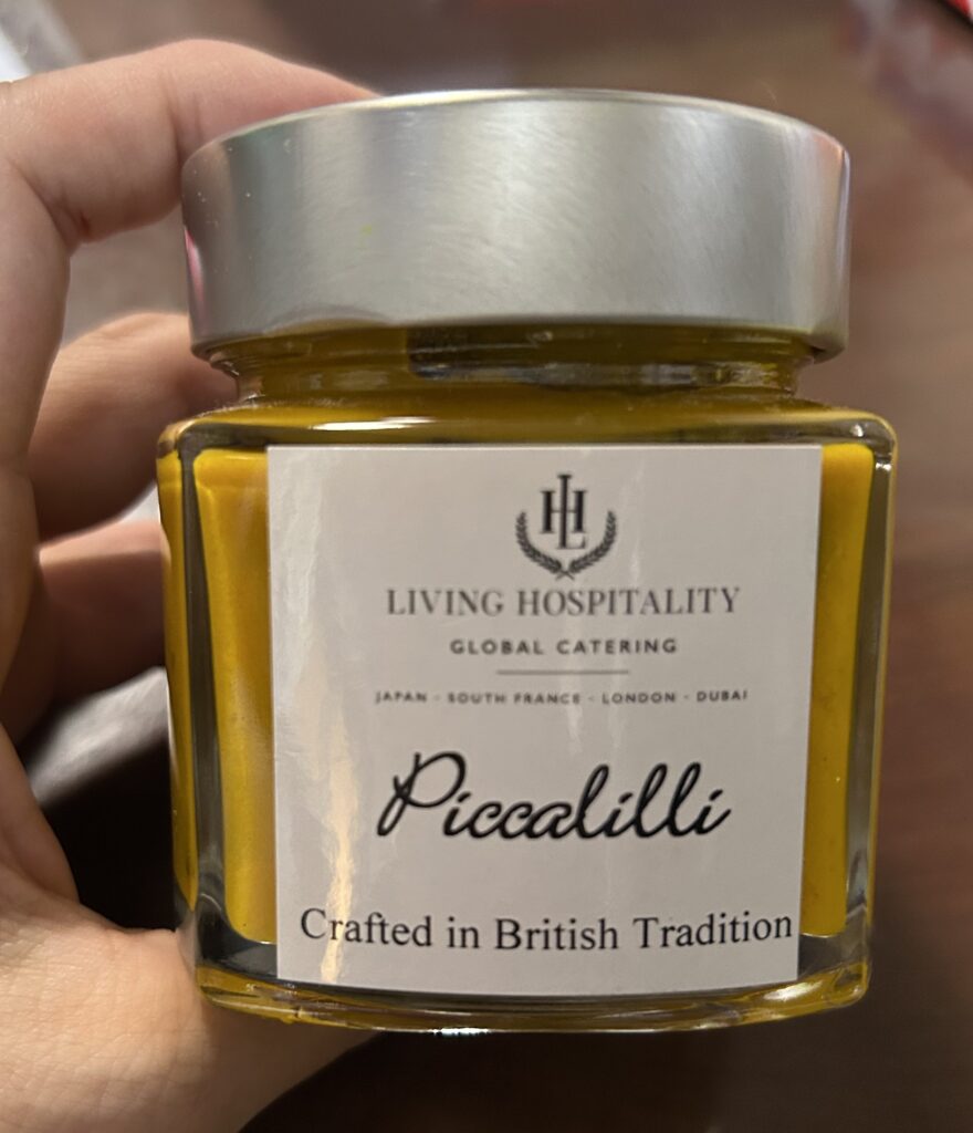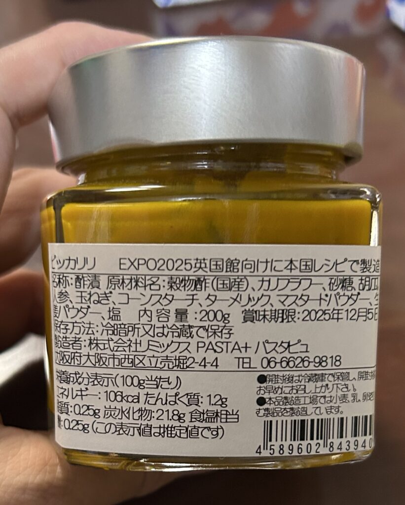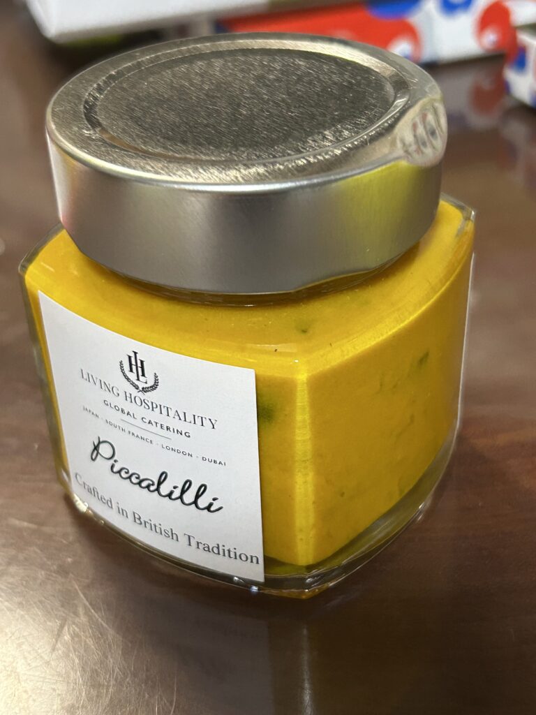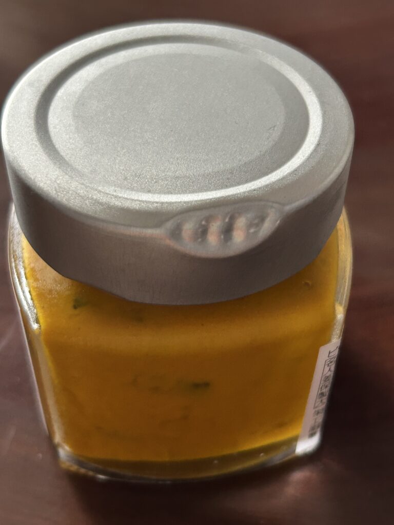 ターメリックが入っていて、カレーのような風味もあるが、酸っぱいマスタードだ。色からかぼちゃが入っているように思えるが、緑色のはキュウリ。カリフラワーや人参も入っている。パンやクラッカーでもいいが、アジフライに添えたらすっごく美味しかった。家族にも好評だった。-