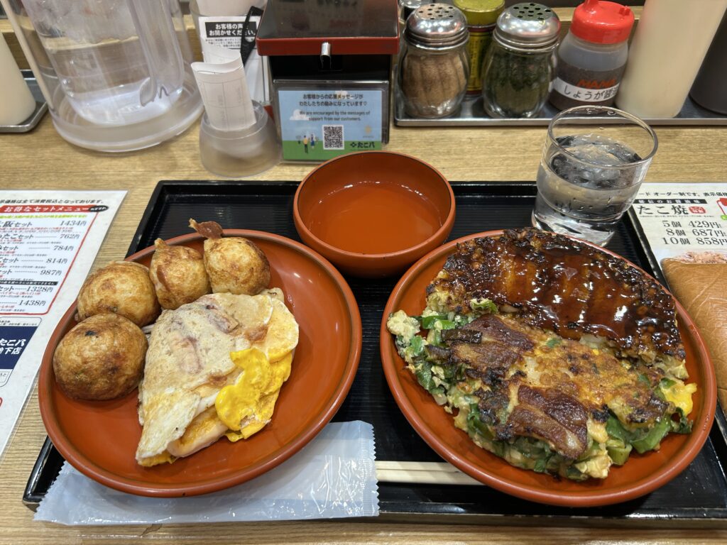 カウンター席だけの店内。席は辛うじて空いていた。メニューを見たら、一番人気が「大阪セット」と書いてあった。お好み焼き、ねぎ焼き、イカ焼きを半分ずつとたこ焼きが付く。多いのかなと思ったが、1400円くらいだったので、一人前の値段だと思った。