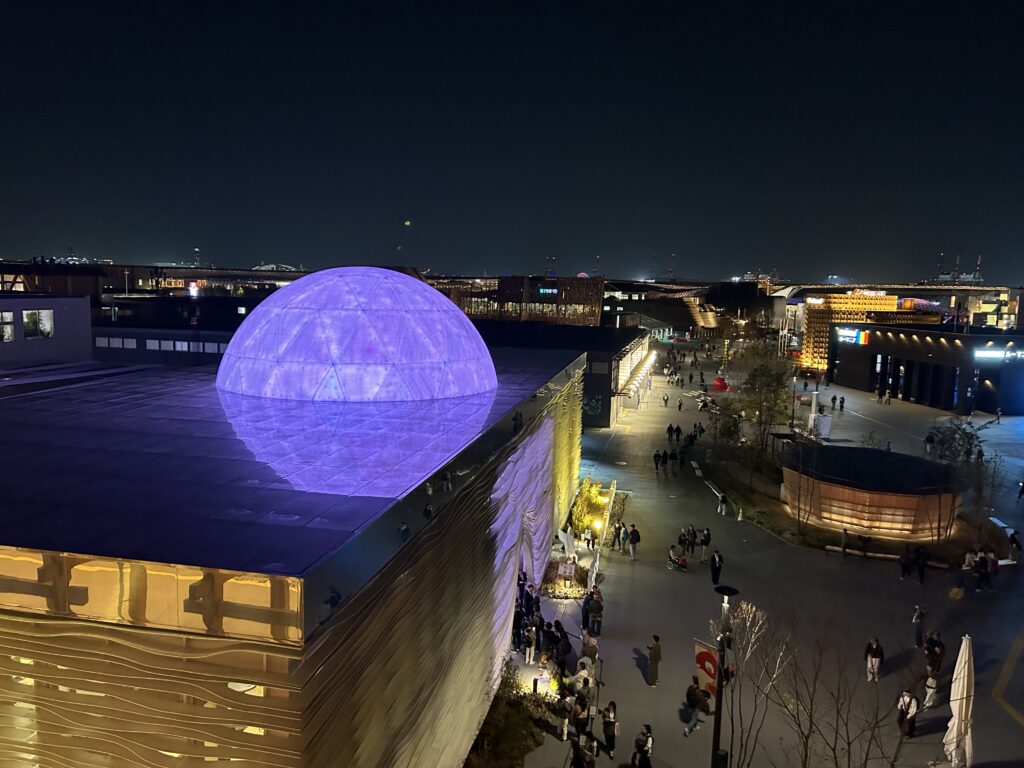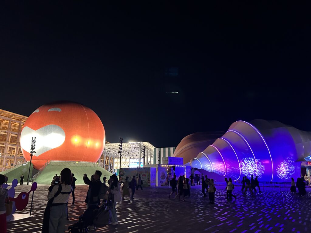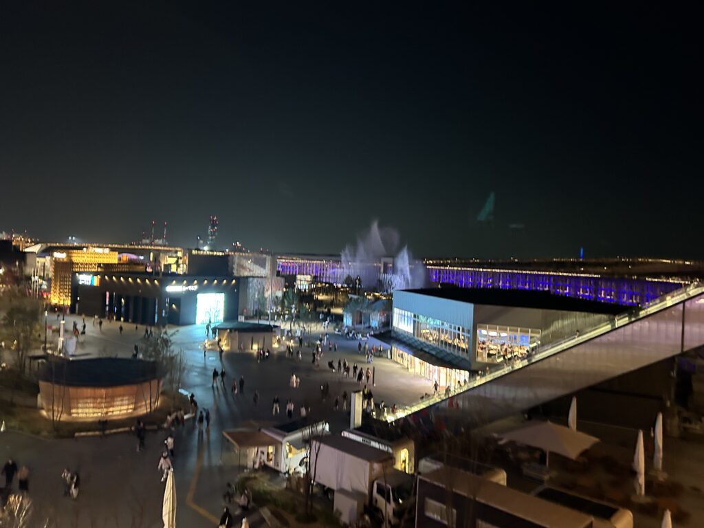 シンガポール館の赤いドットや、オランダ館の紫の玉、そして向こうの方には水上ショーがやっていて、小さく見えた。