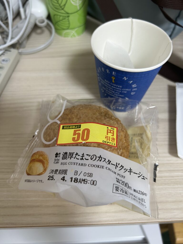 そして、この時間なので50円引きのシールが貼られたデザートがいくつか売っていた。これにしよう。最近クッキーシューに惹かれてね。でも青森で食べたクッキーシューが思ったほどではなくて。