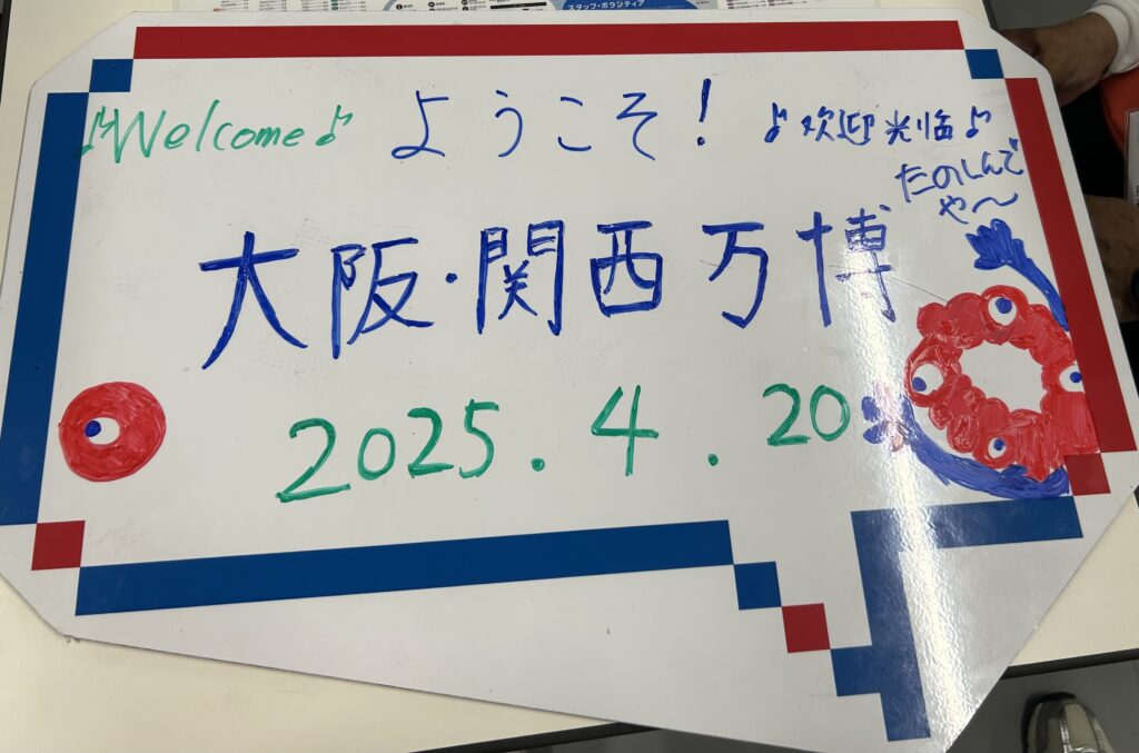 今日も、ボードにメッセージを書く事になった。ディレクターさんが今までの写真を見せてくれた。だんだん蓄積されるデータだな。私が今までの経験から、漢字で書く方がいいと言ったら、私が書く事になった。あまり自信がなかったのだが、書いたら字が上手だと言ってくれる人もいた。ただ、それを太字になぞって、しかも時間がなくて、仕上がりはあまり上手くない。だが、大阪の女性がミャクミャクを描いてくれたので、それなりに良い物になった。