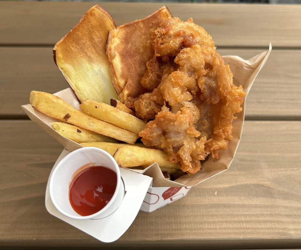 フライドポテトがサツマイモなのでびっくりした。フリットは中身が何だか分からないくらい薄くて、衣ばっかりでしょっぱかった。しょっぱいフリットに甘いサツマイモ。なるほどバランスはいい。そして、サツマイモがたくさんあって、だんだん甘いのが辛くなってきて、そこにケチャップがいい。ケチャップで正解だった。甘い物好きな人だったらハニーソースでいいけどね。それに塩分を摂り過ぎてしまうしね。