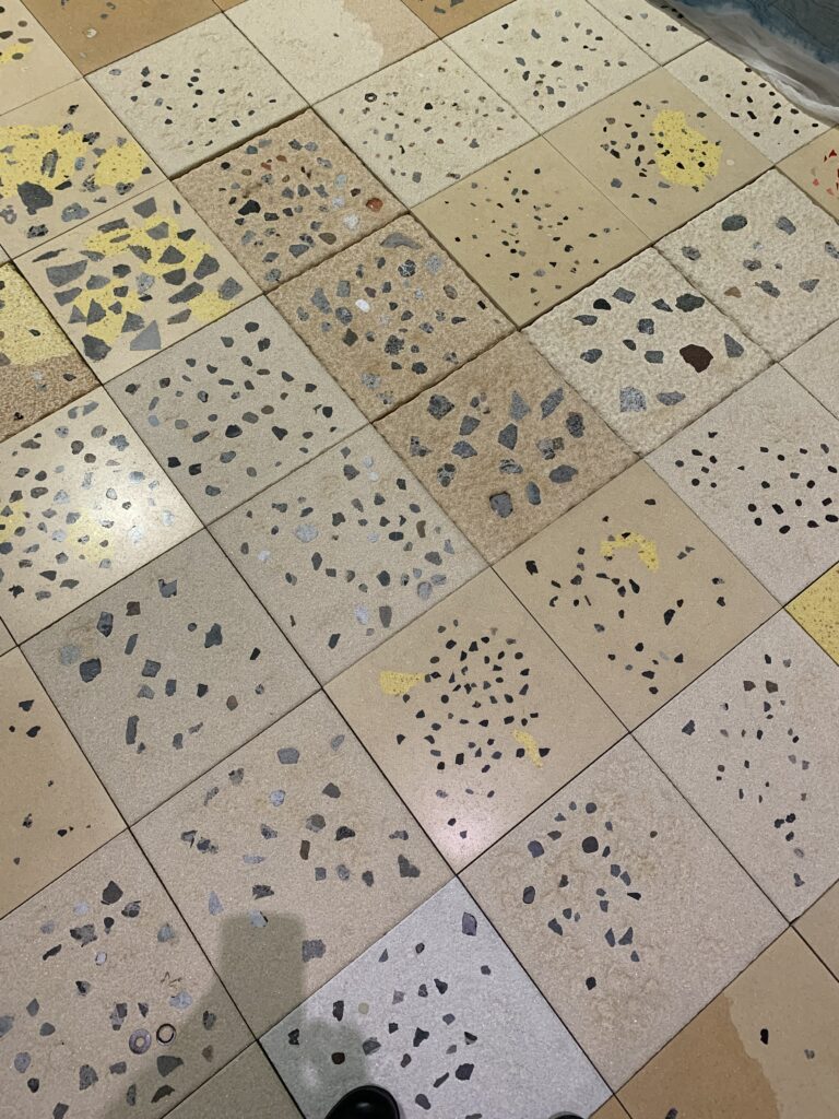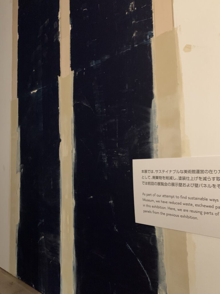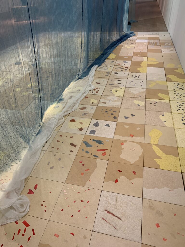 これは、この森美術館のある六本木と、エルメス財団のある銀座の間の活気あるビジネス街で収集された材料を、人造大理石に埋め込んだ床と、藍染めの布。収集された材料と言っても、つまりゴミだよね。ビー玉やおはじき、それから鍵やネックレスチェーンみたいな物も埋まっていた。布は青梅市で制作されて、外に放置され、雨や光で自然の痕跡が…つまり汚れたやつ。