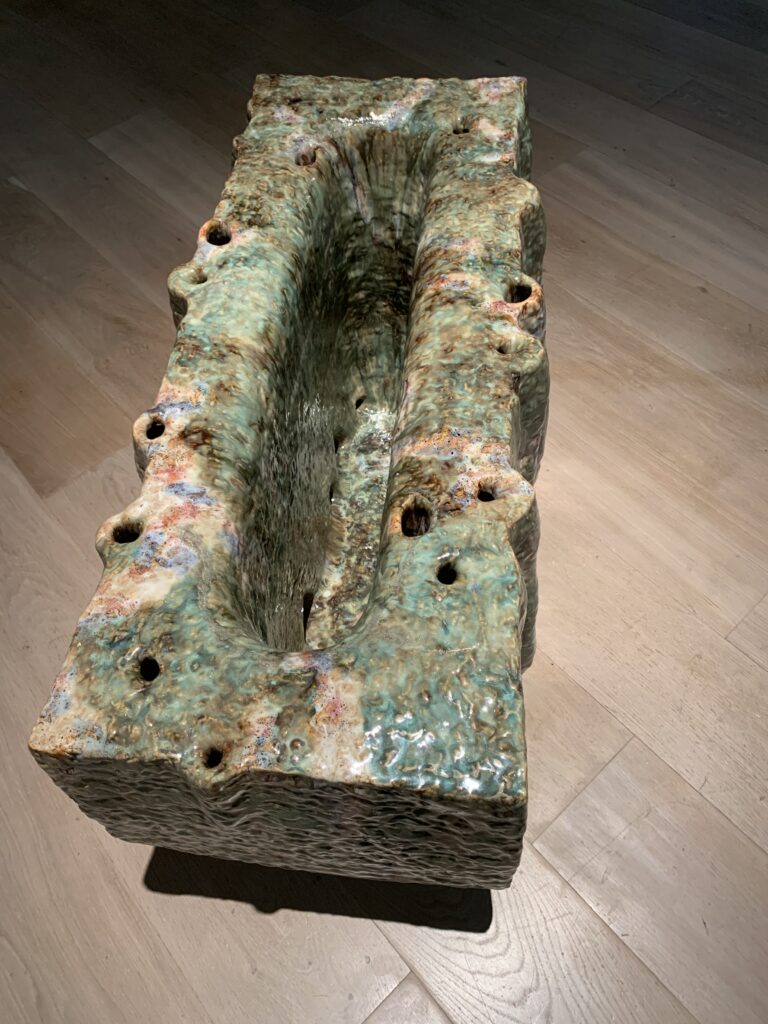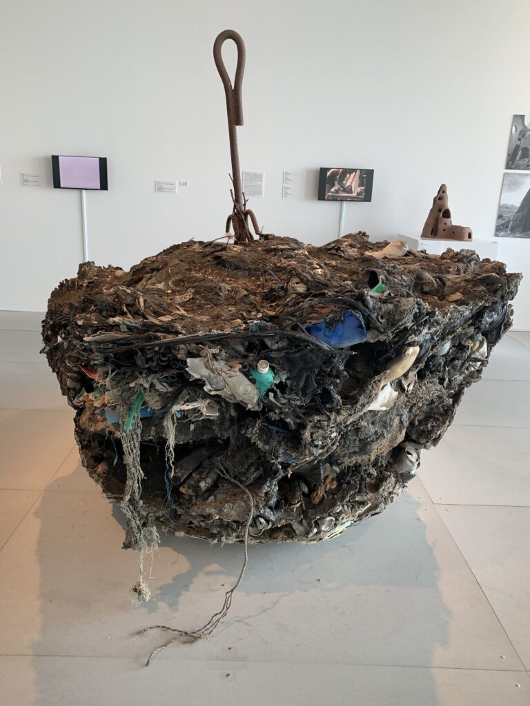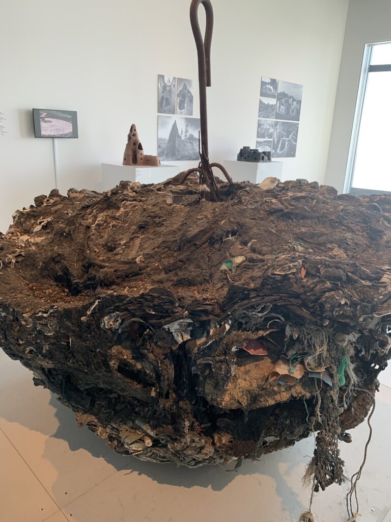 別の角度からも。なんと、お好み焼きとは。広島だけに?これ、プラスティック類を焼き固めたものだそう。パネルや映像で、作っている所が分かるようになっていた。土の穴の中で熱を加えて溶かしたゴミに、モリをぶっ刺して引っこ抜いた感じかな?
