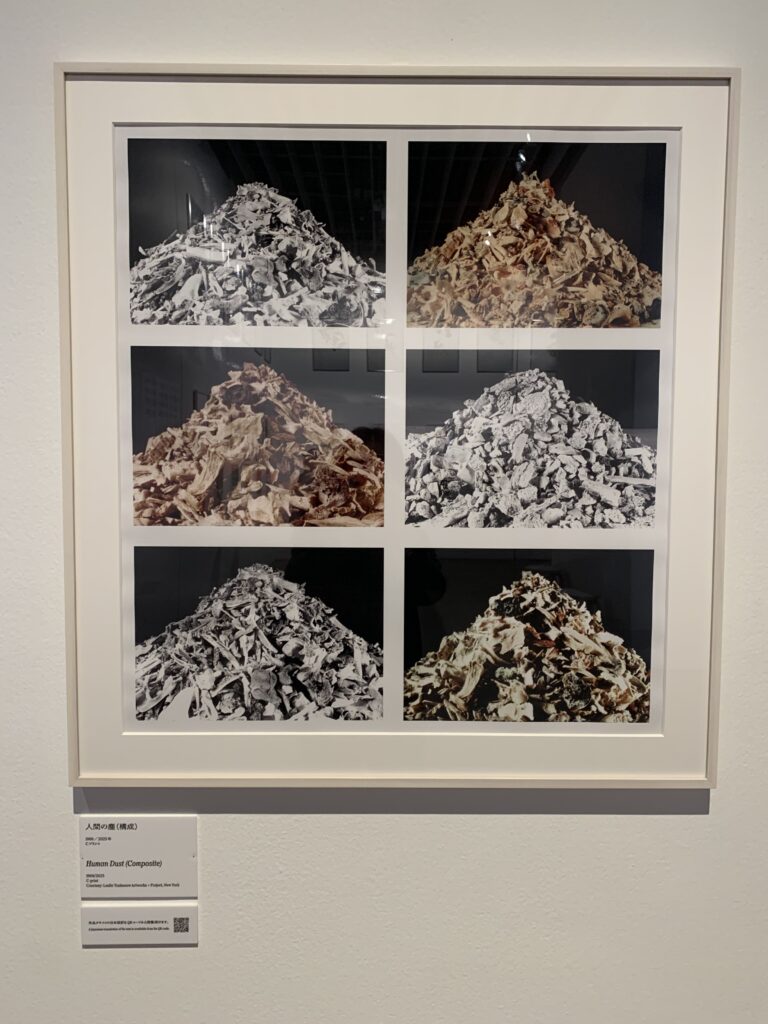 遺灰を集めて撮影したというやつ。これには文章が付いていて、つまり作品の下のQRコードを読みこむと文章が出てくるのだが、そこには遺灰の山の一つ一つに「彼は~」という解説が付いている。こんな人物だったという、解説が。