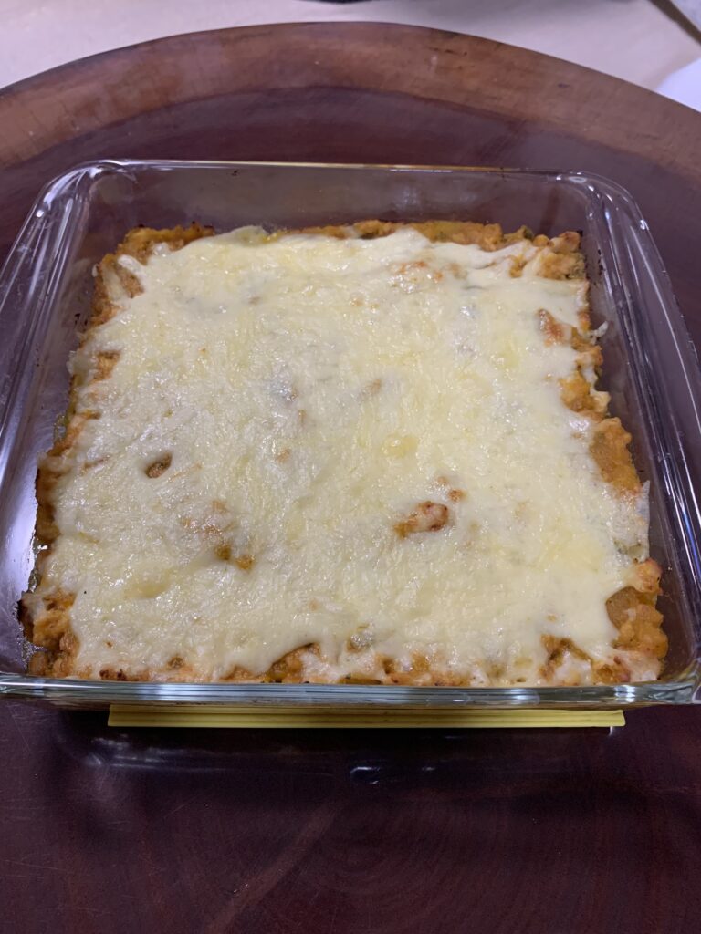 次に、挽肉を炒めて味をつけ、マッシュしたカボチャを混ぜ、それをグラタン皿に入れてチーズをかけて焼いたのが、これ。カボチャグラタン。