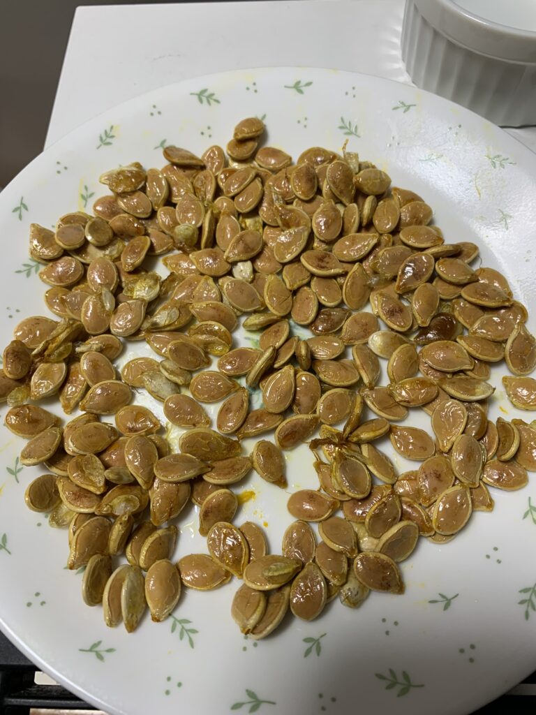 レシピには簡単に書いてある。種を洗ってお皿に広げ、電子レンジで3~4分加熱し、フライパンに油を引いて弱火で色づくまで炒め、塩を振る、と。