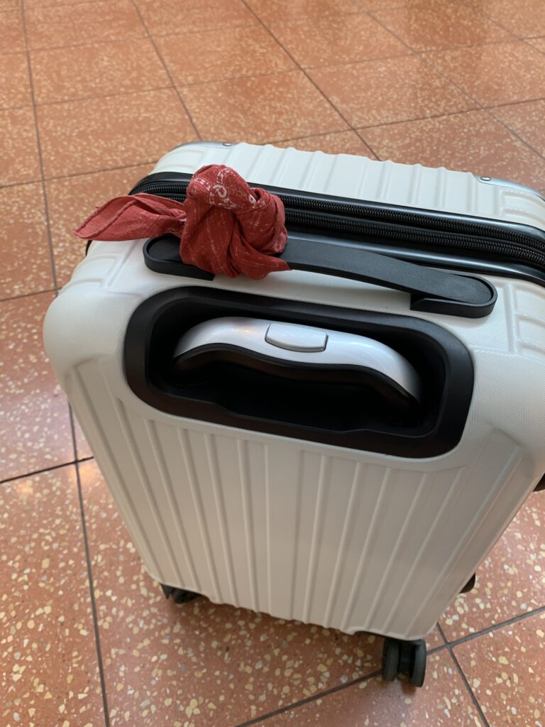 というわけで、預ける事にしたスーツケース。預けるとなると、目印が必要だ。いつもハンカチを巻いたりしていた。それを前日に結んでいたら、帰ってきた次男に