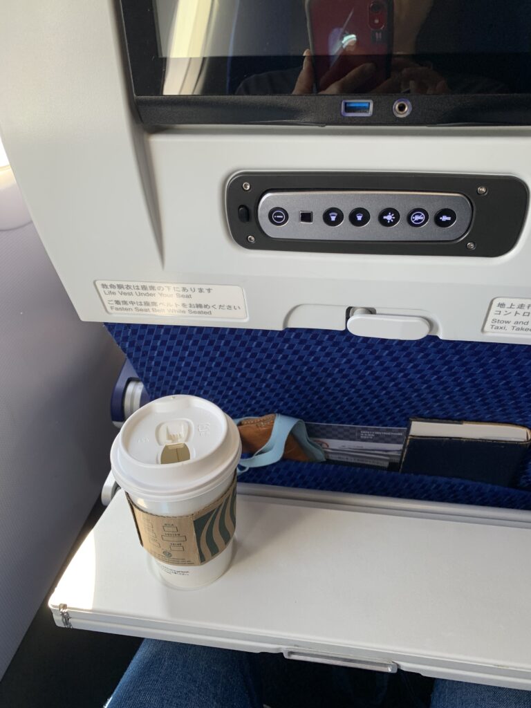 いやー、スコーン美味い。もっとモソモソしているかと思ったら、チョコがふんだんに入っていてそんな事なはい。コーヒーに合うじゃないか。ちょっとポロポロしてしまうのが難点だが、美味しいからよしとしよう。で、グループ3が呼ばれ、あと一口だったので急いで口に入れ、袋を捨ててから搭乗した。コーヒーは持ったまま。おしゃれ?