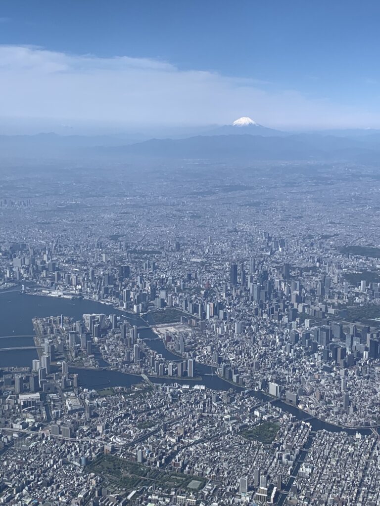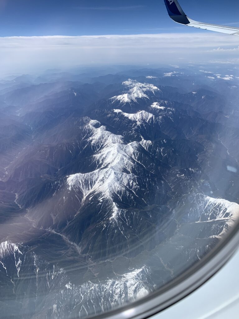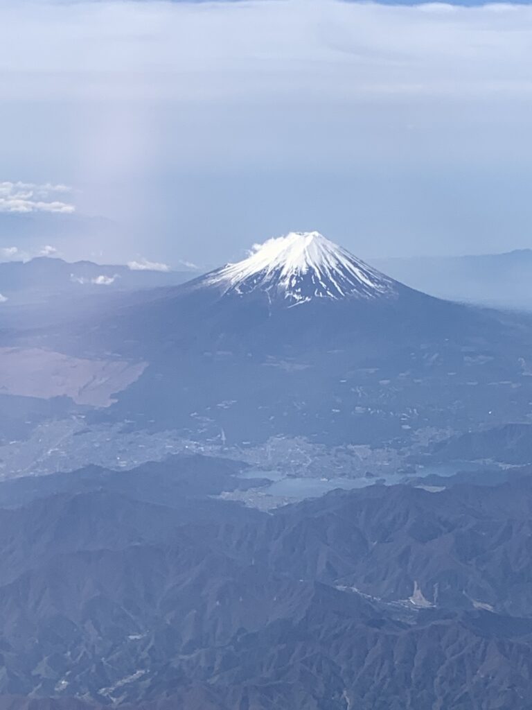 何度か国内線には乗っているのに、ちゃんと富士山を見た事がない。窓際ではなかったり、曇っていたり、夜で暗かったりして。しかし、今日は見えた!こんなに大きく見えるのか。しかも、最近冷え込んで山の上に雪が降ったから、日本アルプスもしっかり分かる。
