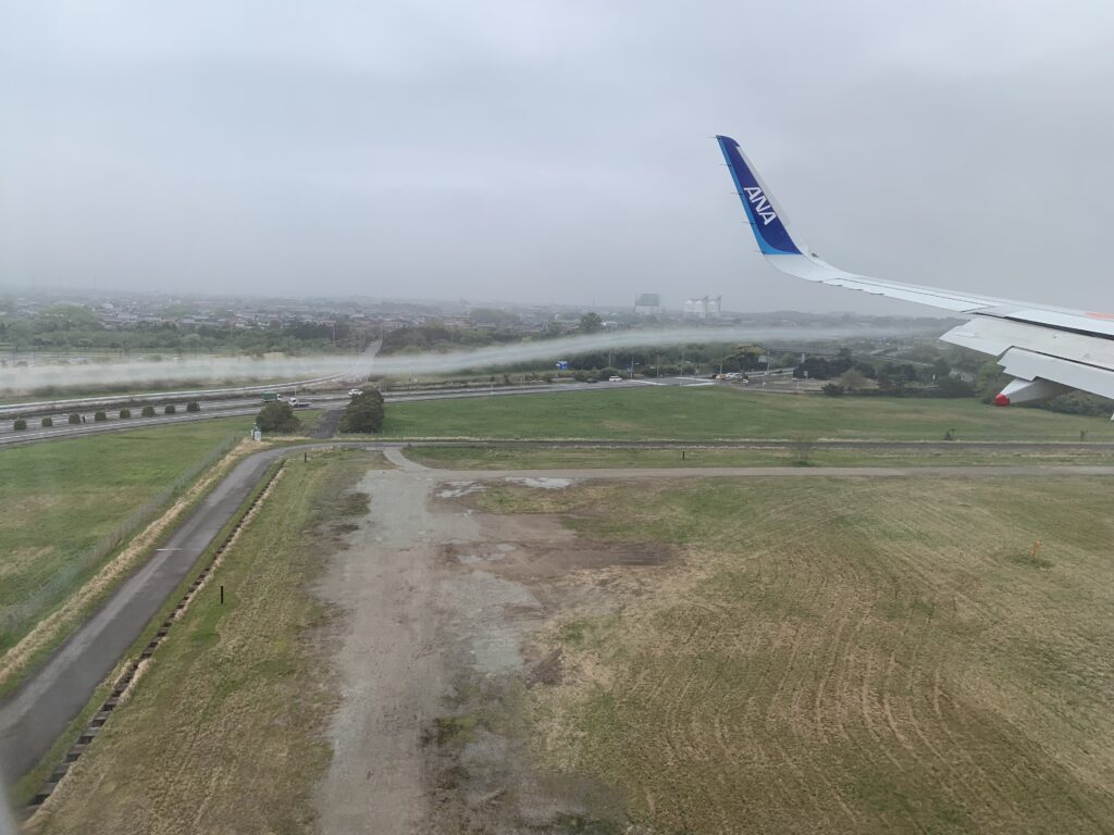そして、米子空港に到着。何か翼から煙りのような、蒸気のような、飛行機雲のような物が出ている。