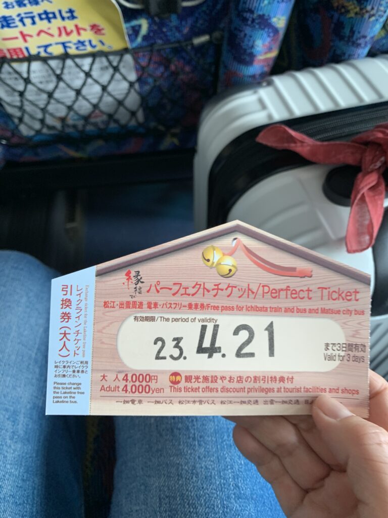 到着し、スーツケースを回収し、総合案内所でフリーパスを買う。その名も「縁結びパーフェクトチケット」。3日間バスや一畑電車が乗り放題なのだ。米子空港から松江駅までの空港バスも。
