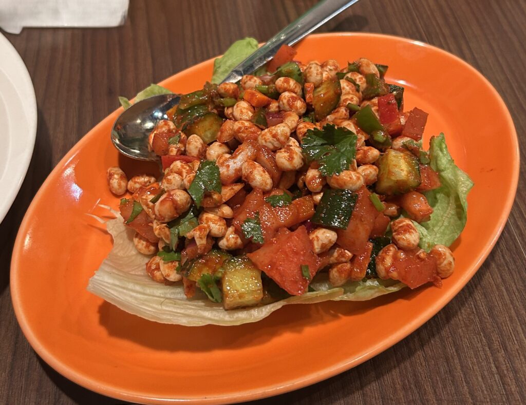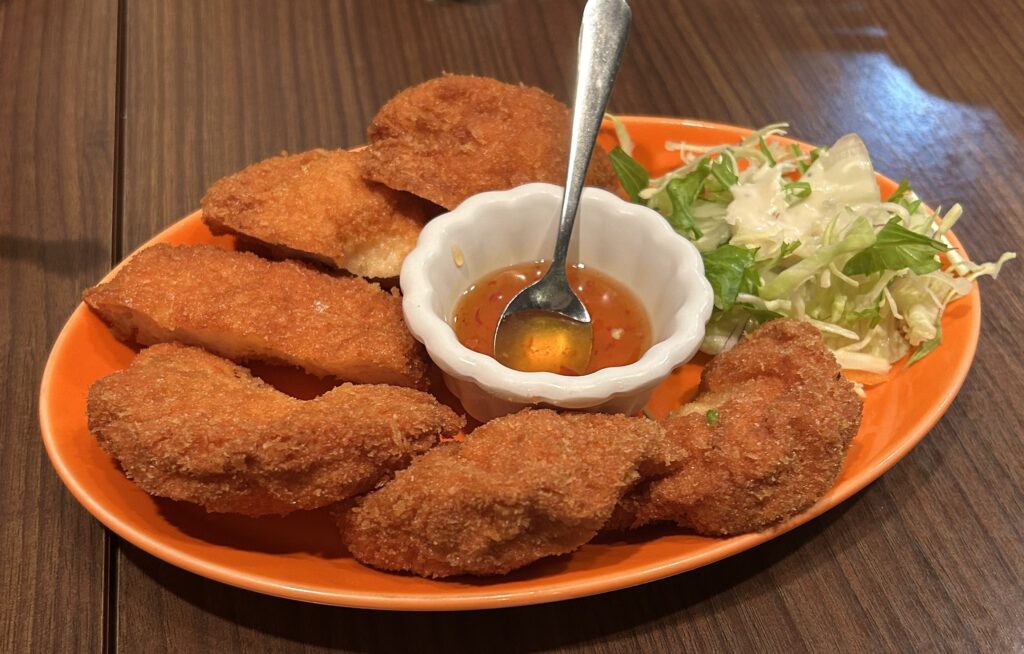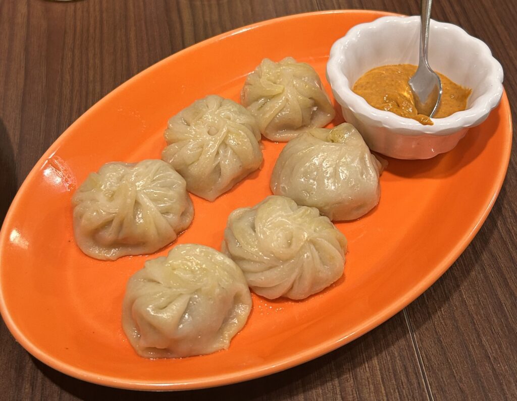 モモは餃子のような物である。形はショウロンポーのようでもあり、肉まんのようでもあるが、味や食感は餃子である。このお店のモモは一口サイズで、ちょっと食べてみるのもいい。添付のソースはカレーだった。