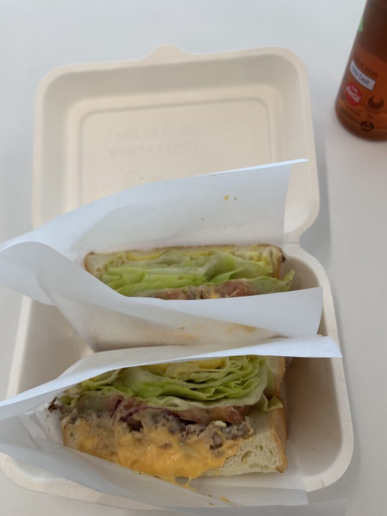 ラーメンは食べにくそうだから、サンドイッチの方がいいかなーと思いながら近づいて行くと、いい匂いがしてきた。ラーメン系の匂い。やばい、こっちの方が断然いい匂いだ。だが、行列が出来ていた。まあ、3~4人だけれども、少ない昼休みを立って並ぶ時間にしたくはない。という事もあり、サンドイッチにした。こっちは並んでいないのだ。