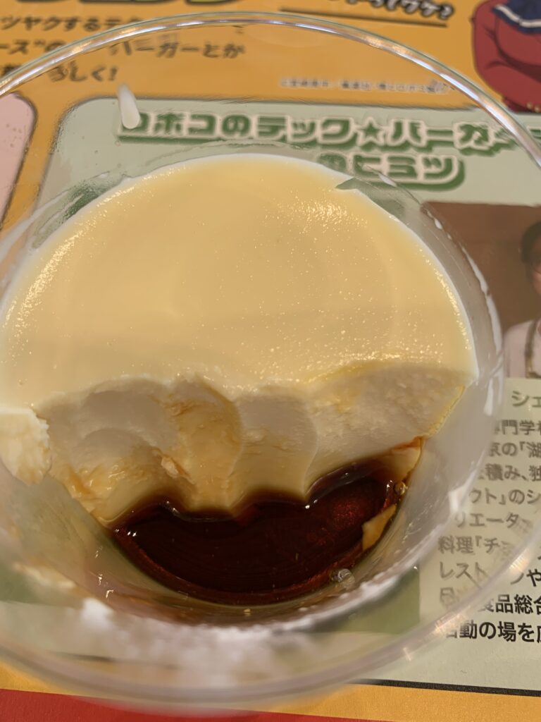 お味の方はどうかと言うと、白い所は淡泊な味で、硬いし、ゼラチンそのままな感じがした。ところが、カラメルソースが出てくると、これが甘くてとても美味しい。そのカラメルソースと一緒に白いところを食べると、なんともまったりとしたいいお味。上品なコクがある。確かに食感は卵とは違う気がするが、これはこれで、美味しいと思う。