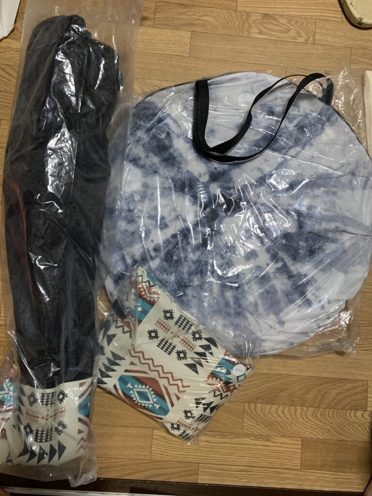 まず、座面の模様が気に入った小さい四角い椅子をいただく事にした。それと同じ模様の、隣にあった4つ穴のテーブルも。これで花火大会に行こうかなと。テントも持ったことがないので、欲しい気がした。でも、どう考えても重たくて、これを持って帰る自信がなかった。しばらく迷ったが、やっぱり辞めたのだった。