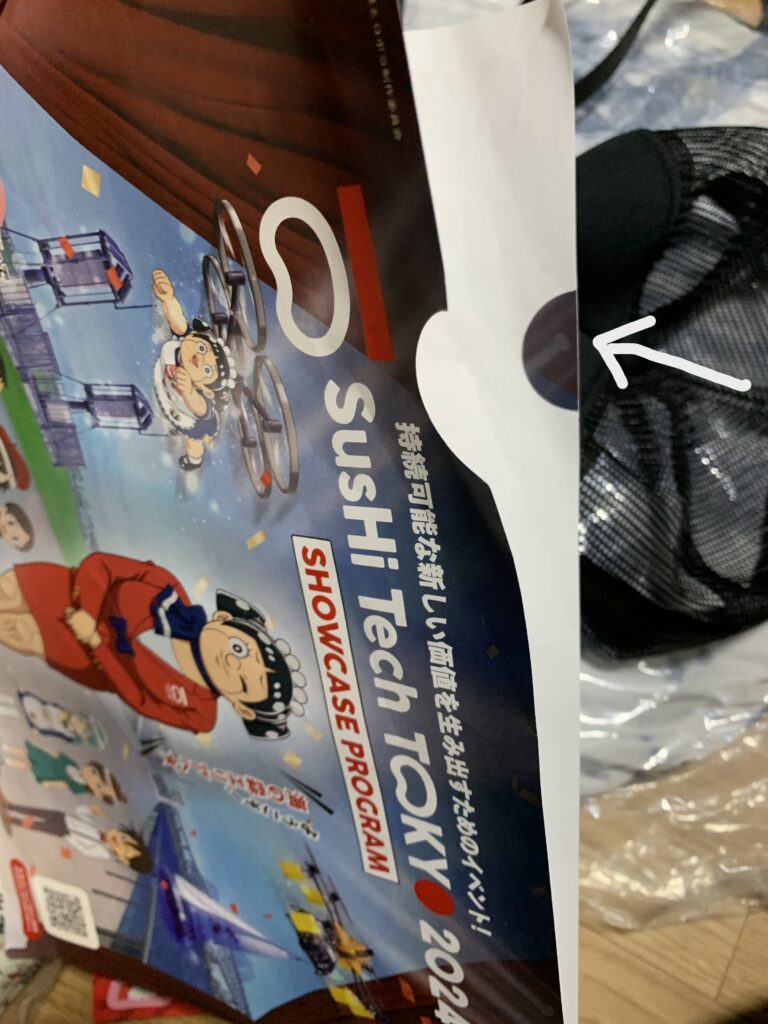 と思ったら、この紙がクリアファイルだった。よく見ると開(ひら)ける。だが、ちょっとわかりにくいか。矢印の先は黒い紙。後ろが黒いから透明のように見えるかもしれないが、そうではない。このクリアファイルは……使い捨て?これもプラスティック製品を使わないというSDG’s的な事なのかな。
