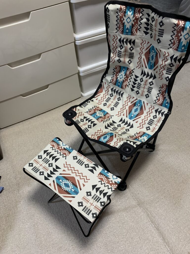 とも言われていた。さて、いざそのいただける物の置いてある場所へ連れて行かれて、まず目に着いたのが椅子。すごく小さい椅子。家具というのではなく、持ち運び用のやつ。そしてテーブル、大きい椅子、テント。