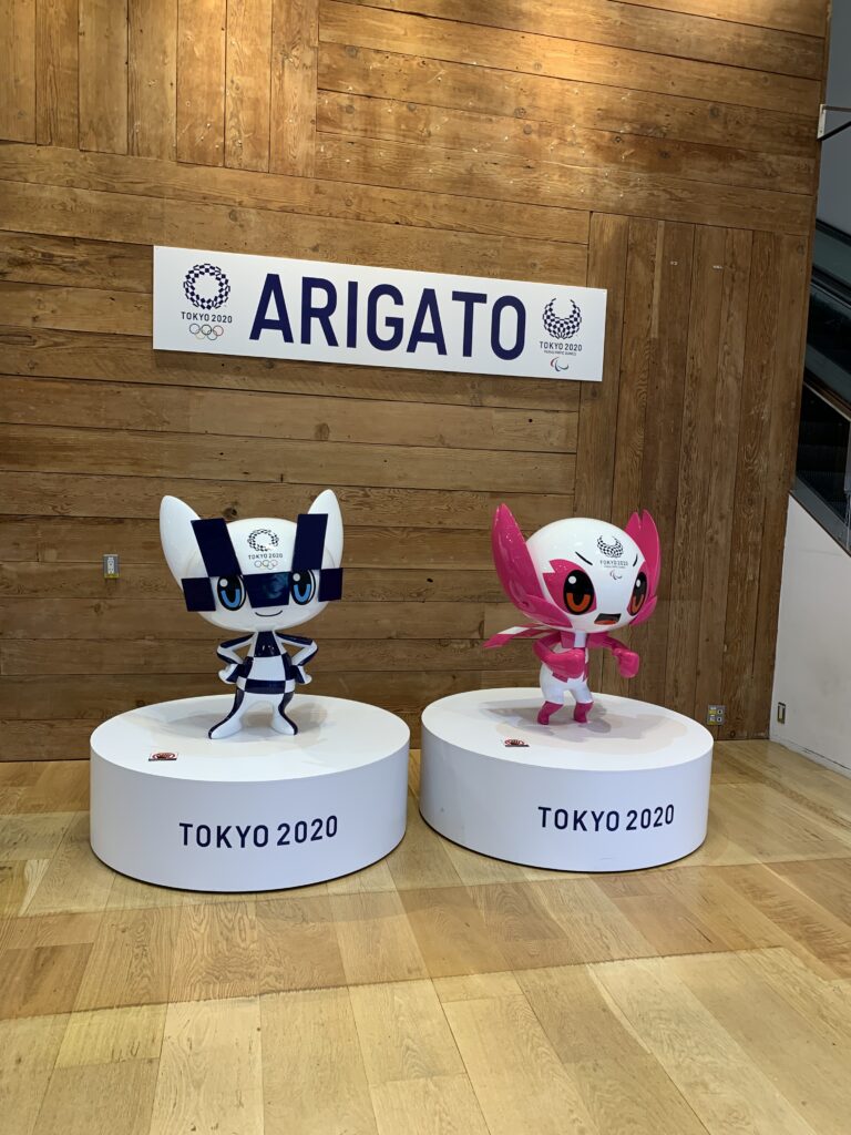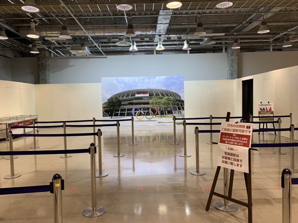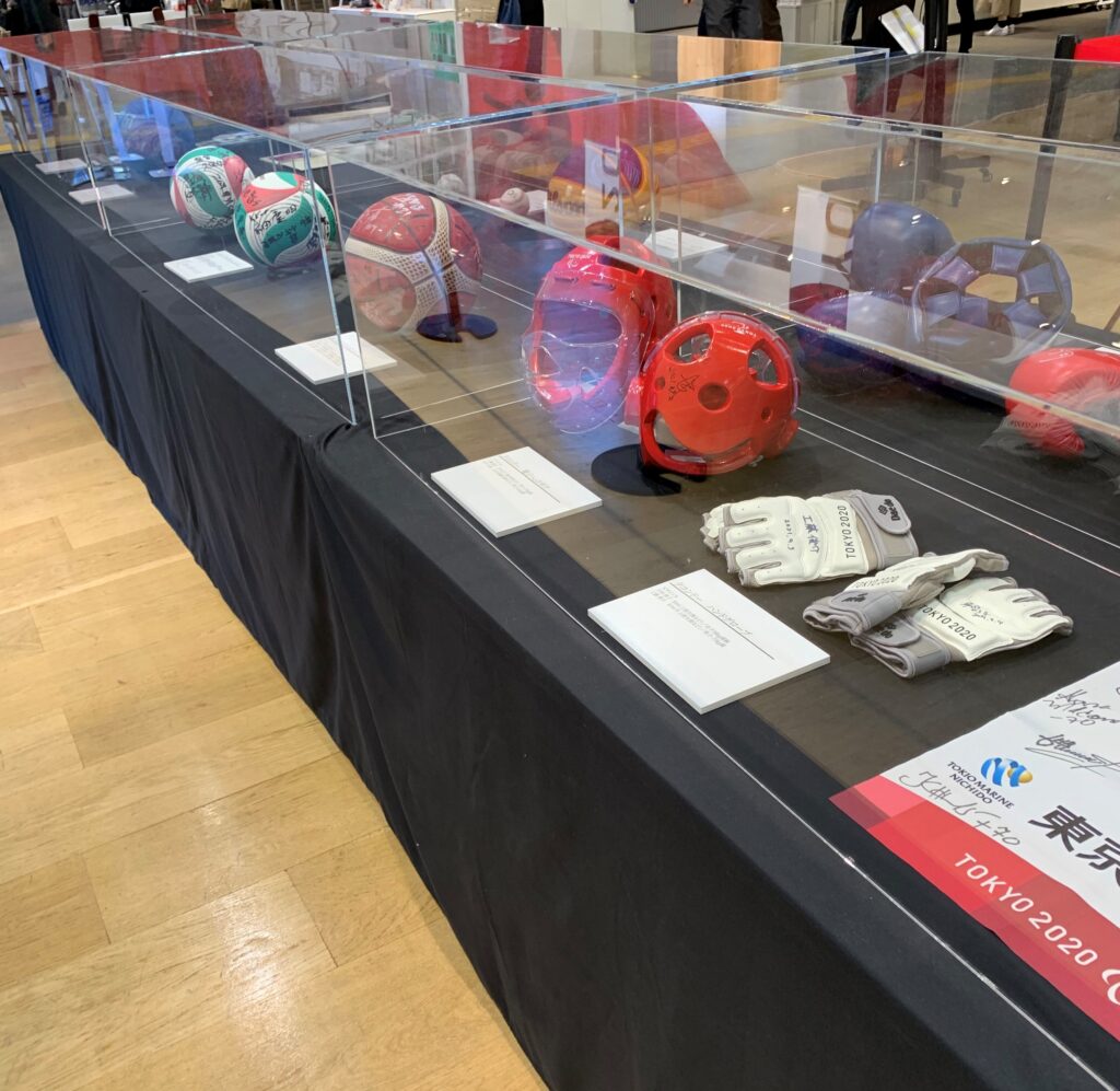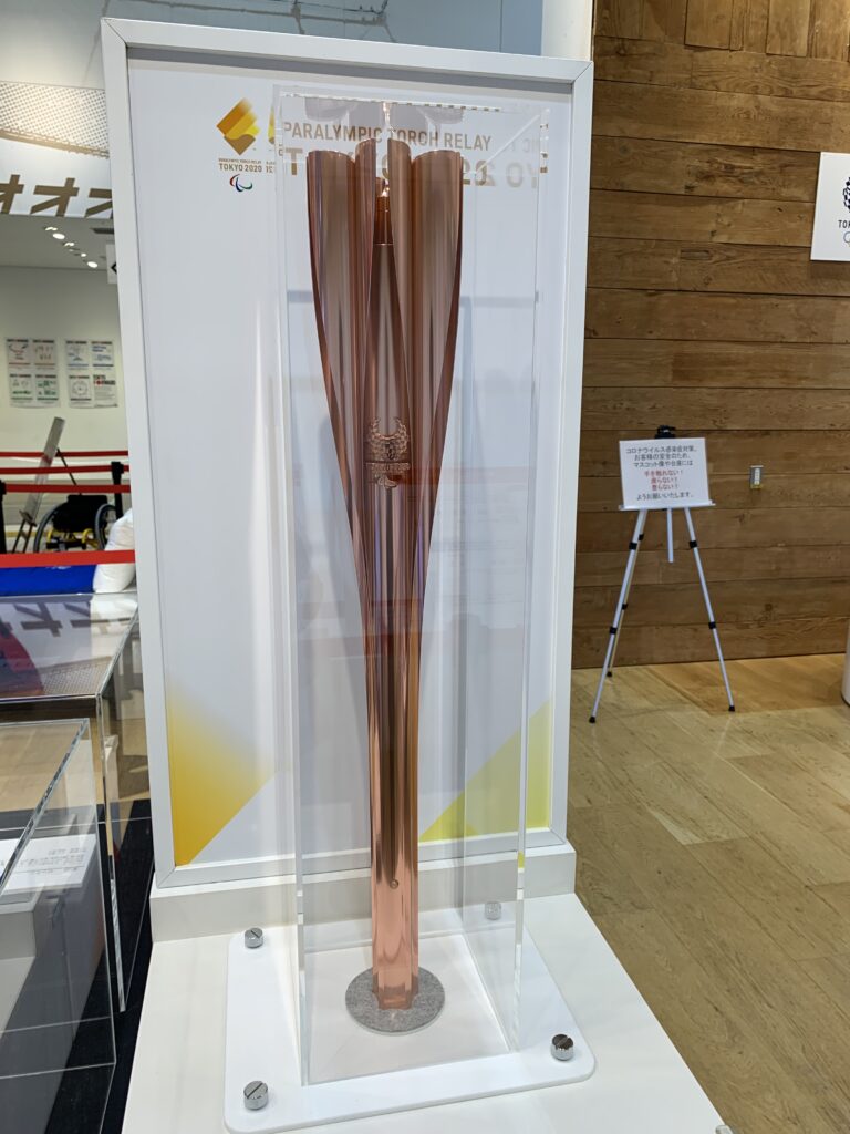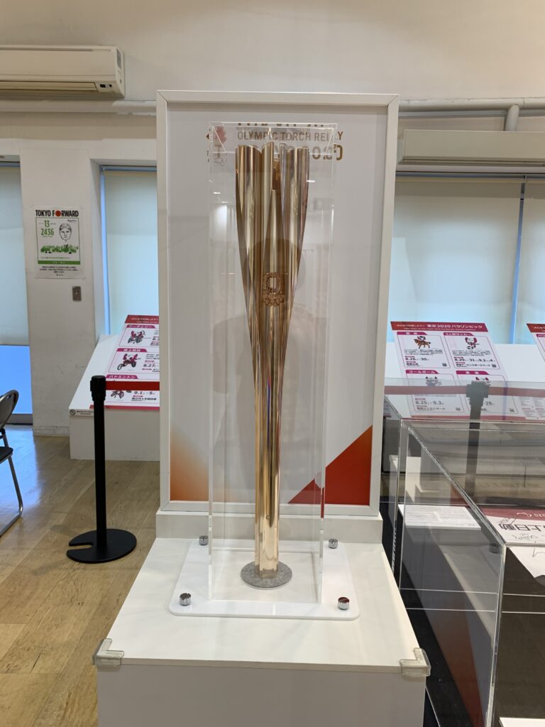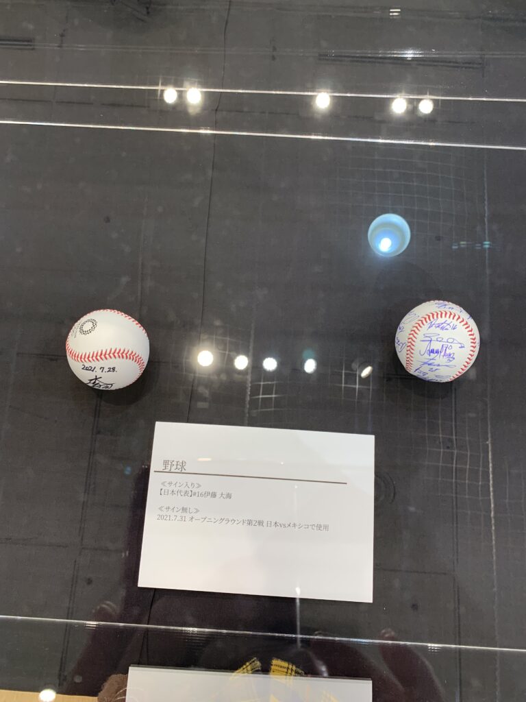 入り口入って右側にショーケースがあり、サイン入りの各種ボールや聖火リレーのトーチがあった。そうそう、聖火とかトーチとか、見に行きたいと思っていたけれど、結局行けずじまいだった。何しろコロナ感染がピークだったから、何となく出かけるのをためらってしまって。今日、トーチを見られて良かった。ガラスケース越しだけれど。