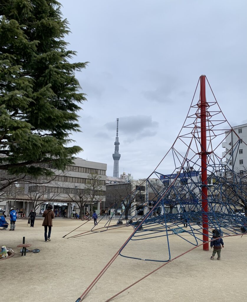 ここは両国。公園の入り口からはスカイツリーが見えた。それにしても、公園の向こう側にずーっとバスが停まっていたのは何故だろう。来た時から帰る時までずっとドアが開いていた。最初、販売車か何かかと思ってしまった。まさか、交通規制中だから走れず、交通規制が終わるまでずっと停まっているとか?