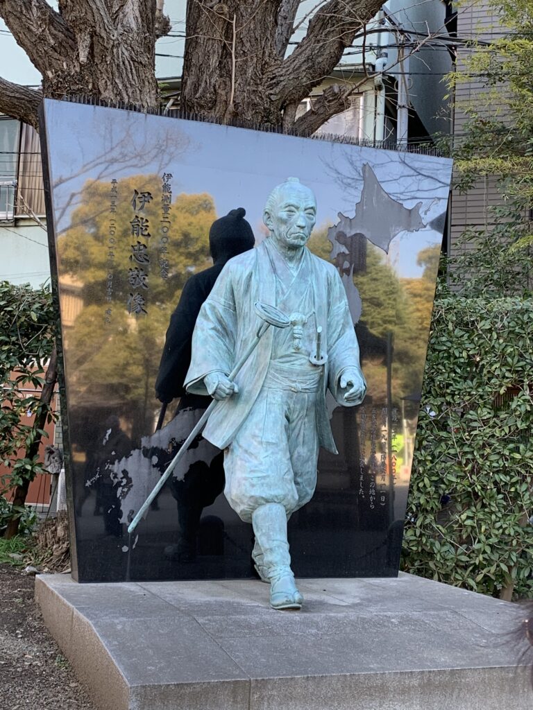 道は平坦で、時々面白い物もあって(「オカマ始めました」という看板があった!)門前仲町の富岡八幡宮の入り口で、電車組と落ち合った。この富岡八幡宮は有名な所だ。でもちゃんと来た事はない。いや、あったっけ?とにかく、この鳥居や伊能忠敬像は初めて見た。