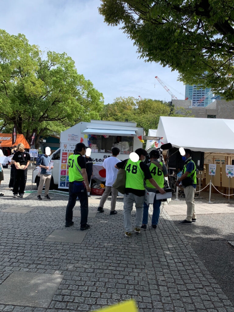 13時を過ぎた頃、テレビの取材班が撮影をしていた。ビブスを着た人が5人くらいいて、カメラを担いでいる人や音声マイクが見える。しばらくすると、私の立っている場所の真ん前にある、学生さんたちがポップコーンを売っている場所に来て、