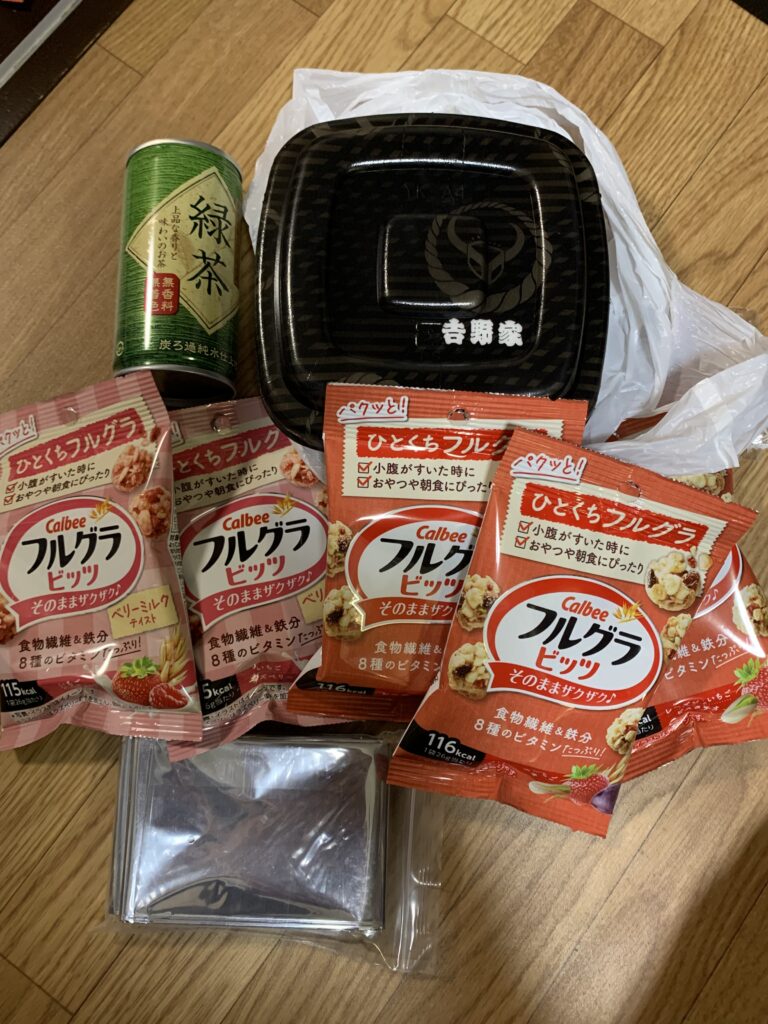 さっきまでと違って、棚と棚の間の空間が無くなってしまった。これでは、バルーンを挟んでおけない。仕方なく、端っこにトートバッグを置き、バルーンは上へ。近くにエコバッグに入れた牛丼も置いた。